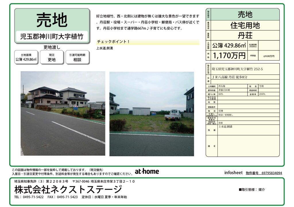 物件名 神川町植竹土地 🔍 価格 所在地 埼玉県児玉郡神川町252-5 交通 JR八高線 丹荘駅 徒歩8分 土地面積 429.86m² 建物面積/専有面積 - 間取り/階数 築年月(築年数) - 設備/条件